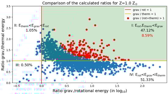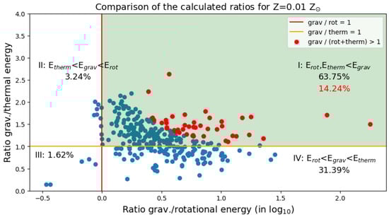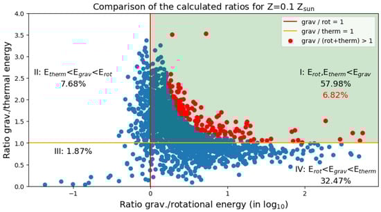 Finally, Figure 14 shows the comparison for Z = 0.01 Z⊙. There are much fewer data points due to the smaller amount of clump realizations produced, which is 197. Here, the percentage of gravitationally dominated clumps has increased up to 63.75%, and the percentage of gravitationally bound clumps up to 14.24%. Because there are so few clumps, this only translates into 28 bound clumps in total. Nevertheless, one out of seven clumps may be gravitationally bound or, alternatively, each clump spends 14% of its lifetime in the bound state. Again, the thermal energy dominates a notable part of the clumps with 31.39%, which is similar to the Z = 0.1 Z⊙ case before. Here, 3.24% of clumps are dominated by rotational energy and 1.62% are completely loose.