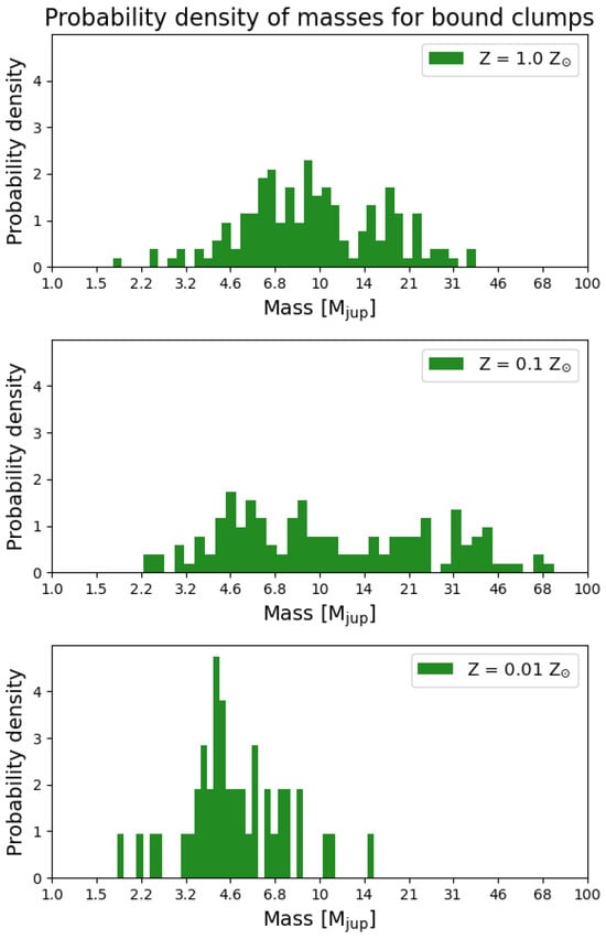 As a further investigation of all bound clumps, we first look at their masses. Again, a probability density distribution is used. The most apparent feature from Figure 15 is that the masses of the Z = 0.01 Z⊙ clumps are generally lower than those of the higher metallicity disks. The low metallicity distribution shows a strong peak around 4 MJup, and its largest value is about 14 Mjup, implying the lack of proto-brown dwarfs. In comparison, the distribution for solar metallicity clumps extends about 30 MJup and its most probable value seems to be between 6 and 10 MJup. Lastly, the Z = 0.1 Z⊙ distribution reaches much higher values than the other two metallicity cases and extends up to about 70 MJup. Nevertheless, there is no obvious peak as in the other distributions, although probable masses again seem to be around 4–5 MJup. For all three cases, the lowest mass that occurs is approximately 2 MJup, in general agreement with numerical simulations of Forgan and Rice [] and theoretical predictions of Jin et al. [] for the solar metallicity case.