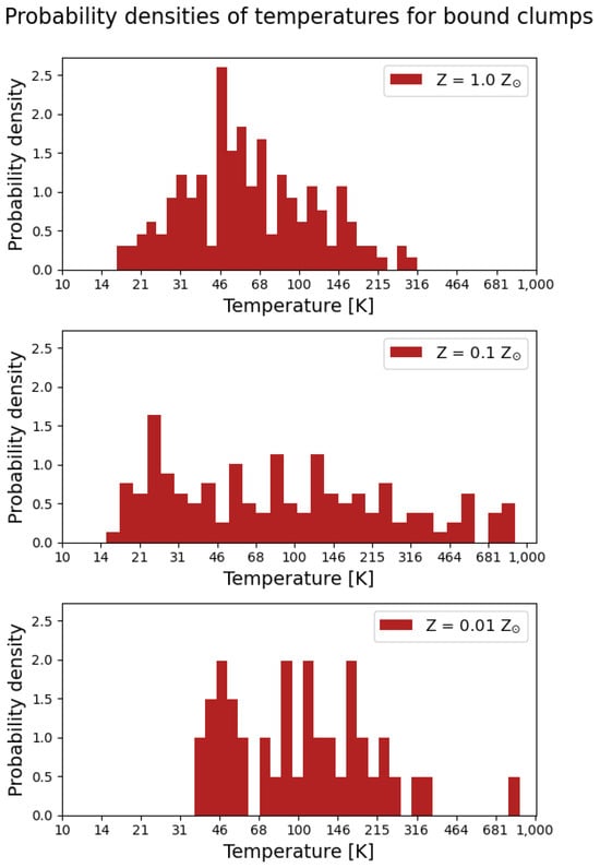 Figure 16 shows the probability density distribution for the central temperature of all bound clumps. The distribution for the solar metallicity clumps goes from about 15 K to 300 K. The most probable value is between 50 and 60 K. Similar to the mass distribution, the distribution of the Z = 0.1 Z⊙ case covers a larger range of values, going from 15 K to just below 1000 K. There is also no evident peak. Model Z0.01 also shows no clear peak. The interesting feature of this distribution is that it starts at higher values than the high-metallicity ones. The covered range is roughly from 30 K to 320 K with an outlier just below 1000 K, similar to Z = 0.1 Z⊙. The most probable temperature seems to be around 45 K. Nevertheless, the entire Z = 0.01 Z⊙ distribution seems to be shifted toward higher temperatures than the solar metallicity one. This may be due to the dust cooling effect, which is metallicity-dependent. Since it is more dominant at high metallicities, the low-metallicity clumps are not affected by it. Thus, their central temperatures remain higher.