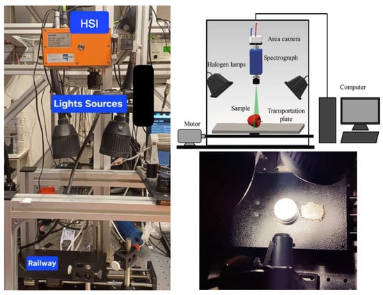 Overview of the hyperspectral imaging setup. (Left) The hyperspectral imaging system (HSI) with labeled light sources (halogen lamps) and components. (Top right) Diagram of the experimental arrangement, clearly annotating the area camera, spectrograph, halogen lamps, transportation plate with sample, and connected computer for data acquisition. (Bottom right) Close-up view of a sample under illumination. The white reference was obtained using a Teflon whiteboard/Spectralon reference with 99% reflectance.