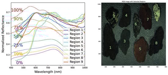 Figure 2 presents a hyperspectral image (400–1000 nm) of volcanic samples from Vulcano, a volcanically active island in the Aeolian archipelago, north of Sicily, Italy, illustrating the effectiveness of hyperspectral imaging in revealing detailed mineral compositions. The RGB color images utilize typical ranges of R: 650 nm, G: 550 nm, and B: 450 nm to approximate true-color visualization, in line with standard practice, highlighting the extracted regions of interest (ROIs). The samples’ extracted regions of interest (ROIs) are highlighted by green numbers overlaid on the image, with detailed spectral analysis presented in the left panel. Nine samples, marked by green numbers, were selected for an in-depth spectral analysis of pyroxene and olivine compositions. The left panel of the figure shows the median spectra for the selected regions depicted in the right panel. Notably, at least 80% of the volcanic samples align with the median spectra for pyroxene and olivine, suggesting that these minerals should ideally be present in all samples, except for regions 5 and 7, which require further analysis. The database template for pyroxene and olivine, as reported by [11], is overlaid in different colors to represent various ranges of olivine–pyroxene compositions. The percentage of olivine (100% pyroxene) composition is indicated with the corresponding color in the figure.