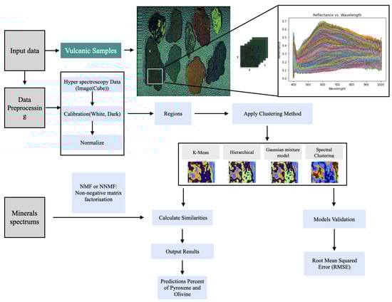 The pipeline details of the analysis in this study are shown in Figure 3. We implemented a comprehensive preprocessing pipeline for the hyperspectral cube data, focusing on enhancing data integrity and optimizing clustering performance. This process began with normalizing reflectance values using white and dark reference measurements, effectively addressing illumination variations and sensor noise that can obscure spectral features. Calibration steps, including dark current correction and radiometric calibration, ensured accurate spectral analyses by mitigating systematic errors that could influence subsequent clustering results. Additional techniques, such as outlier detection and removal, were employed to eliminate anomalous data points that could skew results. This meticulous approach ensured high-quality, well-structured hyperspectral data, laying a robust foundation for reliable clustering outcomes and enhancing our ability to accurately interpret the mineralogical characteristics of volcanic materials. Data acquisition utilized a line scanning technique, with each sample positioned on a motorized slider table. As the table advanced, the camera captured the spectral data in a sequential line-by-line manner, producing an initial hyperspectral image. Calibration minimized noise and ensured the accuracy of reflectance values, achieved through dark and white reference measurements. The dark reference was established by measuring the signal from the detector when no light was present, while the white reference was obtained using a Teflon whiteboard/Spectralon white reference with 99% reflectance (shown in the bottom right panel of Figure 1). Subsequently, the calibration process normalized the hyperspectral images using the following formula: