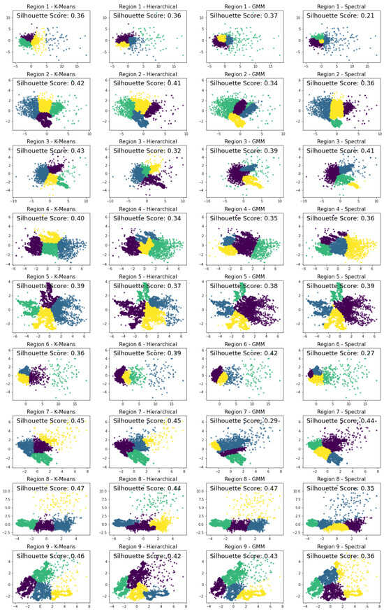 The first method, K-Means clustering, partitions the data into distinct clusters by minimizing the variance within each cluster. It is widely used due to its simplicity and efficiency, making it suitable for large datasets. For example, in region 8, K-Means achieved a silhouette score of 0.47, the highest among all methods, suggesting excellent cluster separation. Next, we applied hierarchical clustering, which builds a hierarchy of clusters either through a bottom-up (agglomerative) or top-down (divisive) approach. This method provides a dendrogram representation, allowing for a visual exploration of the data’s structure and the number of clusters. In region 7, hierarchical clustering achieved a silhouette score of 0.45, indicating well-separated clusters, the highest among other regions. We also utilized the GMM, a probabilistic model that assumes all data points are generated from a mixture of several Gaussian distributions with unknown parameters. GMM is particularly advantageous for soft clustering, where data points can belong to multiple clusters with different probabilities, making it more flexible than K-Means. Note that in region 8, GMM had the highest silhouette score of 0.47, the same as K-Means, indicating similarity in both methods’ clustering. Finally, we employed spectral clustering, which utilizes the eigenvalues of a similarity matrix to reduce dimensionality before applying a clustering algorithm. This method effectively identifies clusters in non-convex shapes, leveraging the relationships between points in the original high-dimensional space. In region 7, spectral clustering achieved a silhouette score of 0.44, demonstrating moderate cluster separation.