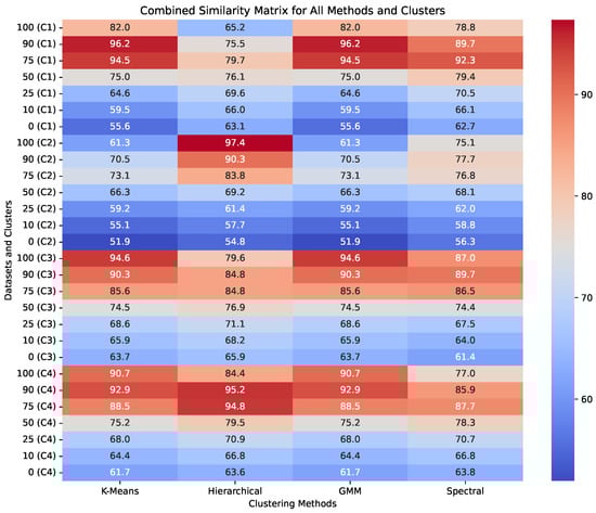 Comparative analysis of mineral composition (the percentage of olivine (100% pyroxene)) similarity across clustering models using NMF. This heatmap illustrates the effectiveness of the four clustering algorithms—K-Means, hierarchical, Gaussian mixture model (GMM), and spectral clustering—in grouping mineral compositions, specifically olivine (O) and pyroxene (P), across different clusters (C1–C4). Each cell represents the similarity percentage for specific mineral mixtures, with color gradients indicating the strength of mineral presence from high (red) to low (blue). The results highlight the unique clustering tendencies of each algorithm.