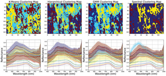 By utilizing multiple clustering approaches, we aimed to extract relevant features from the data, improve analytical accuracy, and gain a deeper the spectral characteristics of the volcanic samples. This multifaceted strategy allowed for a comprehensive exploration of the complexities and variabilities inherent in the data. The use of diverse models reveals different aspects of the dataset, thereby enhancing our understanding of spectral characteristics, as illustrated in the clustering maps. Relying solely on a single method could introduce bias, so employing multiple models validates our findings and ensures consistency in cluster identification across approaches. Given the complexity of hyperspectral data, which often display non-linear relationships and variable cluster shapes, it is essential to apply different algorithms to capture a broader range of structures.