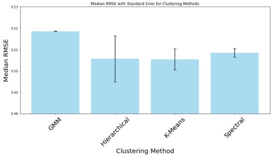 The bar chart presents the median root mean squared error (RMSE) values for four clustering methods with standard deviation error: GMM, hierarchical, K-Means, and spectral.