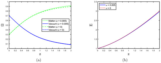 (a) Evolution of energy densities with the redshift for different values of ; (b) similarly for the normalized Hubble rate . Differences are small for these observables with the typically small values of . The background evolution is essentially CDM-like.