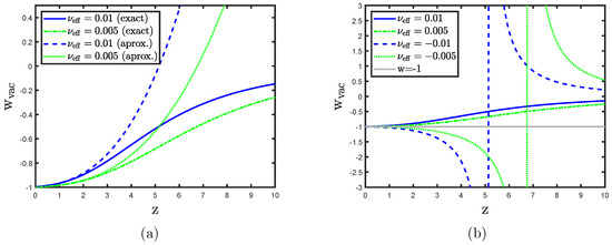 (a) EoS of the running vacuum evolving with the redshift in the late universe. Both the exact (47) and approximate (48) formulas for different positive values of are shown. The approximate curves deviate significantly from the exact ones for ; (b) Here, we consider both signs of , and all curves follow the exact formula (47). The vertical asymptotes appear only for ; see the text for an explanation.