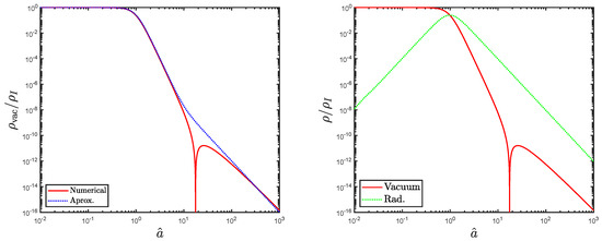 As a first approach on our way to solving the cosmological equations with the VED given by Equation (50), let us assume that in that equation can be approximated by the mentioned constant value from (52). This is tantamount to assuming that the effect of the logarithmic term in it is negligible even after inflation. We will come back to this point later on, but let us make things simple to start with. For constant, the cosmological equations can be solved analytically. In this case, Equation (50) can be considered as a particular case of the generalized VED form8