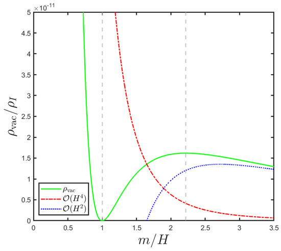 In particular, we note that all the quartic mass terms ∼ introduced by the quantum corrections on the rhs of Equation (34) have exactly canceled out in the final expression for the vacuum pressure. In addition, we find that the net quantum correction to the classical vacuum EoS vanishes identically for const. since it depends only on time derivatives of H. This feature will play an important role when we discuss the inflationary epoch. We should also remark that the mentioned quantum corrections also vanish identically in the conformal limit, , as could be expected.