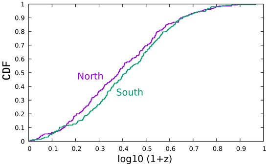 The radial coordinates of the 542 GRBs were obtained from their observed redshifts, which relate to the radial distance via equations governing the cosmological expansion of the universe. The cumulative distribution of these redshifts is demonstrated in Figure 1. Of these, 262 were found in the northern galactic hemisphere, while the remaining 280 were found in the southern galactic hemisphere. A two-sample Kolmogorov–Smirnov test of these redshift distributions showed no significant difference between the distributions in the two hemispheres (, ).