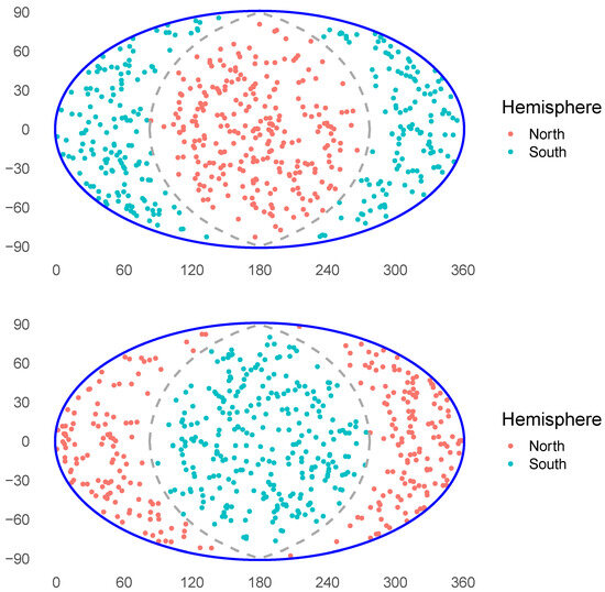The sky distribution of the 542-GRB sample viewed from the galactic poles. The top/bottom figure is centered on the northern/southern galactic pole. The gray dashed line represents the location of the galactic equator.