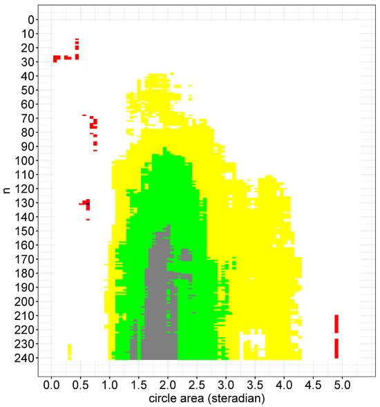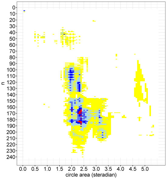 The bootstrap probabilities from the northern hemisphere on the (n, A) plane. White: ; yellow: ; light blue: ; blue: ; red: . Only blue and red blocks were significant.