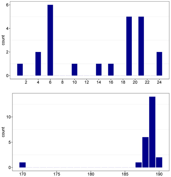 An example of an anisotropic distribution spanning 24 points in Figure 3, where the probability is less than . The top panel shows the distribution of the starting points, while the bottom panel shows the distribution of the ending points. See the text for more details.