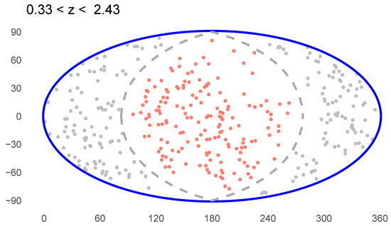 Horvath et al. [48] compared the distributions of the two hemispheres. Figure 13 in that paper demonstrates that the two hemispheres exhibited similar, large-scale isotropy over most of the plane where the differences were small. This means that the observed K distributions in the plane were similar in both hemispheres. However, there was a large region in the northern hemisphere in which the distributions differed by more than 14 GRBs with a certain radial slice and spherical cap. This suggests that the northern hemisphere contains a large area in which there are significantly more GRBs than one would expect for a homogeneous, isotropic distribution. However, Horvath et al. [48] did not explore the differences for and thus was not able to determine the upper limit on the cluster’s extent in the existing GRB data.
