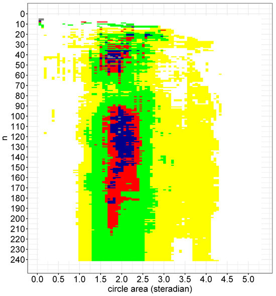 The first of these clusters occurred for and ( steradians), with an observed . Only one case (5, ) reached the significance level in our analysis, with the bursts found within a redshift range of . Four of the five GRBs in this group were located close together (further information can be found in Horvath et al. [48]).