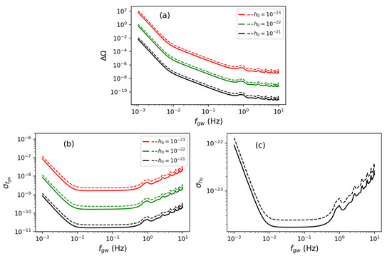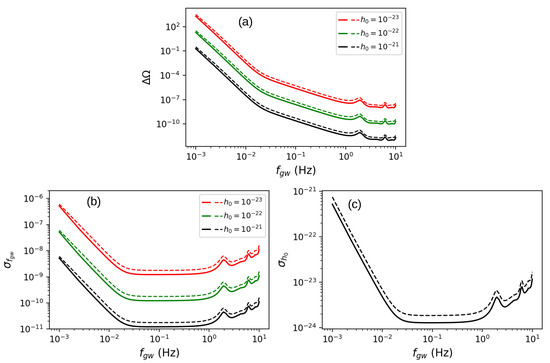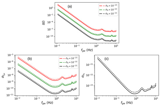 , as a function of the GW frequency and the same three GW amplitudes. We may notice, in agreement with Equation (59), that it scales linearly with the GW amplitude, and the results for the two polarizations differ only by a factor of