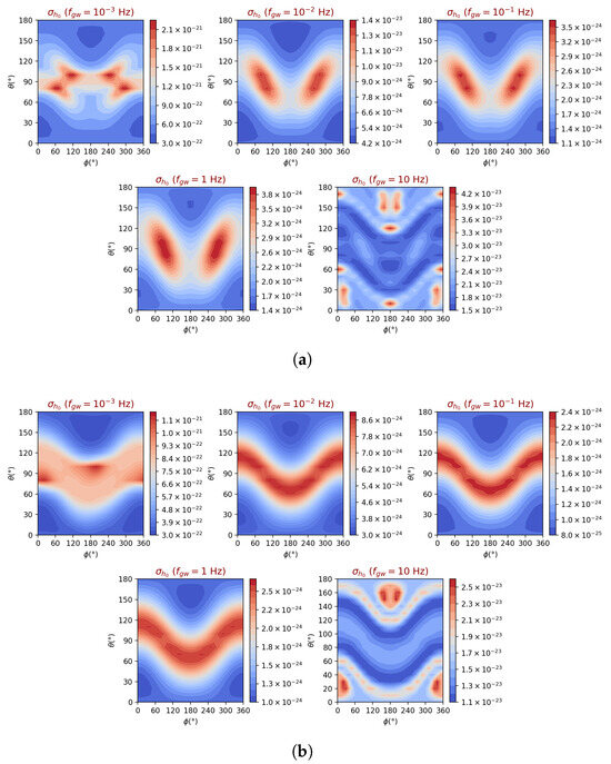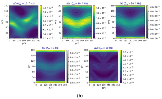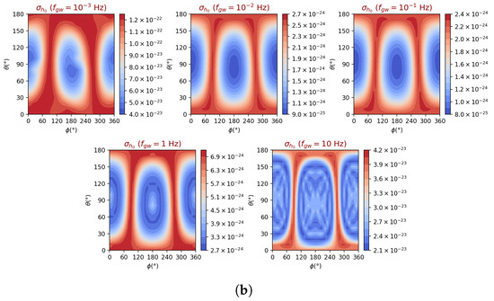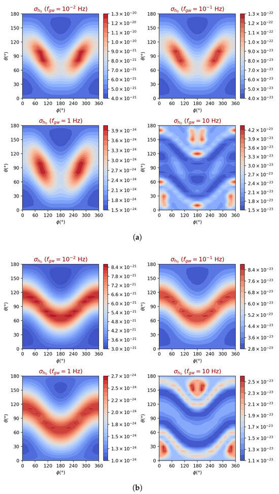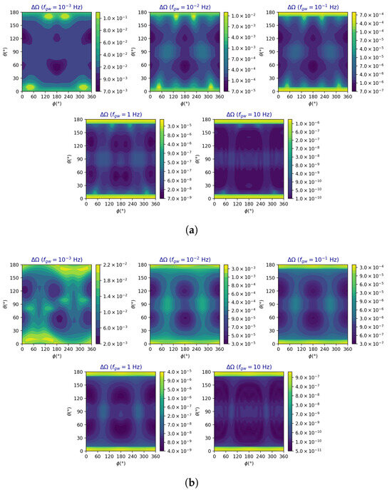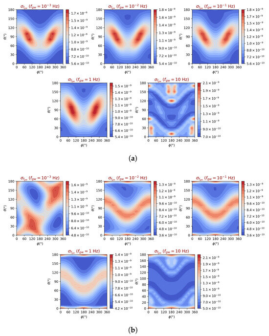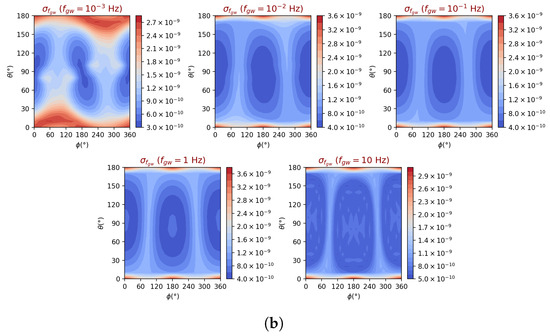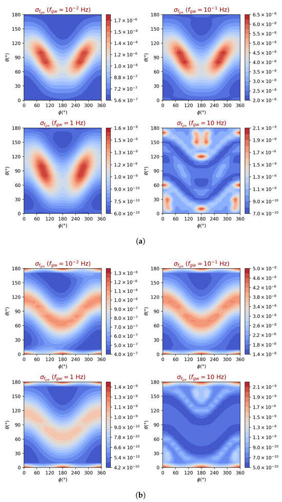 Figure 6b covers circularly polarized signals. Both contour plots show a dynamic range equal to approximately 10 across the entire sky and for all GW frequencies considered. Although the difference in magnitude of the precision between the two polarizations is on average equal to a factor of