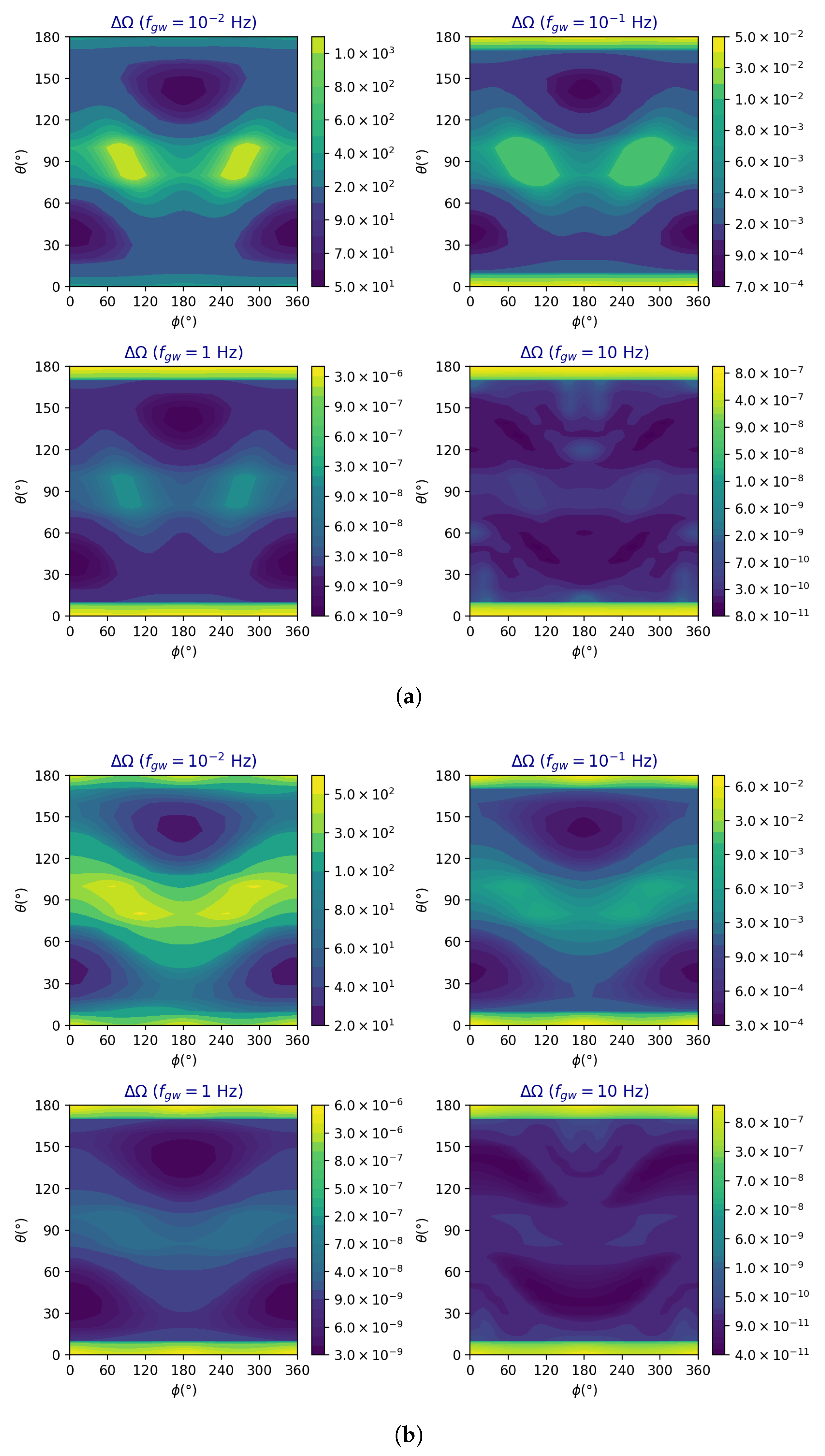 Figure 9, we show the precisions in the GW amplitude as functions of the GW frequency, the location of the source in the sky, and for linearly (a) and circularly (b) polarized signals. It can be seen that the minimum and maximum values differ by only a factor of approximately three, indicating relatively small variation between different frequencies. Similarly to angular precision, these graphs show a loss around