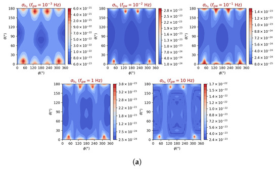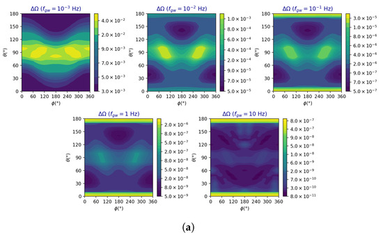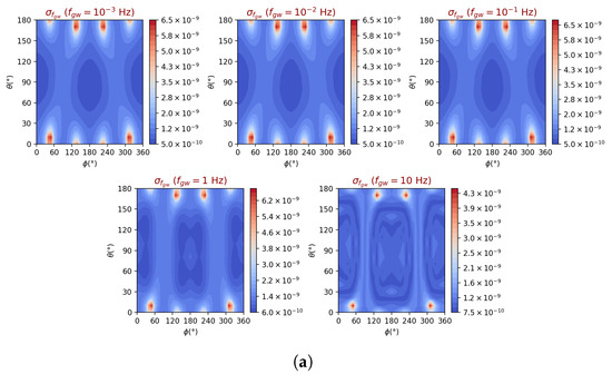 In the following contour plots, the precision of each parameter is now presented not for a specific source, but as a function of the angular positions ( and ) at frequencies ranging from to 10 Hz.