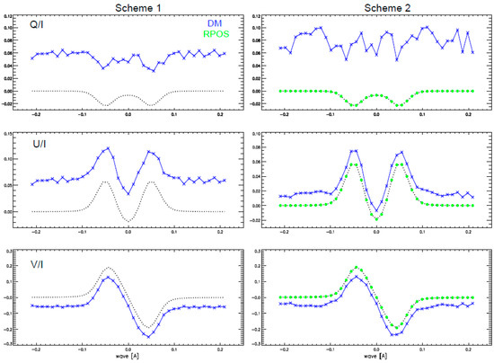 - For Scheme 3, from the comparisons in Figure 3, one can draw the same conclusion that formula is the only one to reproduce the synthesized Stokes profiles perfectly. In addition, this validity does not depend on whether linearly polarized light (left column) or circularly polarized light (right column) is used for reference measurements.