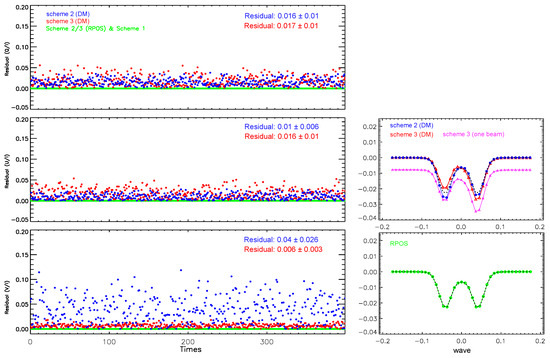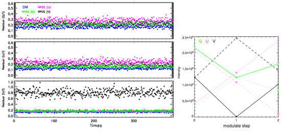 Firstly, it is found that the residuals of the DM method are slightly smaller than those of the RPOS technique in both schemes. For example, in Scheme 3, the residual of the DM method is approximately 0.09 ± 0.011, whereas that of the RPOS method is around 0.12 ± 0.014 regardless of the specific polarized signal used for reference measurements. In Scheme 2, however, the issue becomes more complex as shown in the left panel of Figure 6: The residual of the DM method is about 0.14 ± 0.02 (the blue dots), while the residual of the RPOS technique varies depending on the polarization single used for reference measurements. Specifically, using for reference measurements (green dots) yields the smallest average demodulation residual for the three Stokes parameters (, , and from up to bottom), which are approximately , , and for , , and , respectively, while using for reference measurements (black dots) results in noticeable errors, especially in , reaching up to .