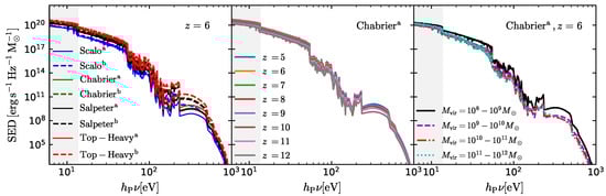 Stellar mass normalized SEDs of high-z galaxies. Left panel: average SEDs of galaxies from 8 IMF models at , i.e., Scaloa model (blue solid line), Scalob model (blue dashed line), Chabriera model (green solid line), Chabrierb model (green dashed line), Salpetera model (black solid line), Salpeterb model (black dashed line), Top-Heavya model (red solid line), and Top-Heavyb model (red dashed line). Middle panel: average SEDs of galaxies from Chabriera model at z = 5 (blue line), 6 (orange line), 7 (green line), 8 (red line), 9 (purple line), 10 (brown line), 11 (pink line), 12 (gray line). Right panel: average SEDs of galaxies within four halo mass ranges from Chabriera model at , i.e., – (black solid line), – (magenta dashed line), – (red dash-dot line), and – (cyan dotted line). Gray shading indicates locations where .