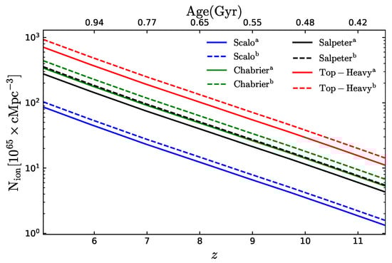 Redshift evolution of volume averaged ionizing photon number density  from 8 IMF models, i.e., Scaloa model (blue solid line), Scalob model (blue dashed line), Chabriera model (green solid line), Chabrierb model (green dashed line), Salpetera model (black solid line), Salpeterb model (black dashed line), Top-Heavya model (red solid line), and Top-Heavyb model (red dashed line). It also shows the age of the universe at redshift.