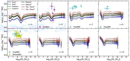 where  is the observed ,  is the simulated , and  is the 1- error of . The  results at  to 12 are shown in Table 2. At , the Chabriera model is the best fit with the UVLF observations; then, the Salpeterb models are the best. At , the Chabrierb model is the best, followed by the Chabriera model. At , the Top-Heavyb model is the best, followed by the Top-Heavya model. At , the best-fit model is the Top-Heavyb model, followed by the Top-Heavya model. We can then conclude that at  the UVLFs from the Salpeter and Chabrier models are closer to the observational results, while at  the ones of the Top-Heavy model are more consistent with the JWST observations. This is consistent with some recent theoretical works [,,,], which denotes that a top-heavy stellar IMF is necessary to explain the observations.