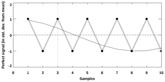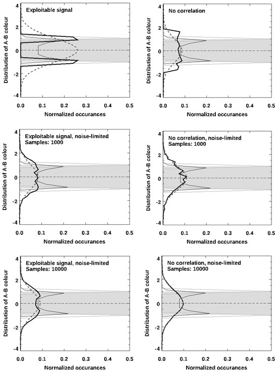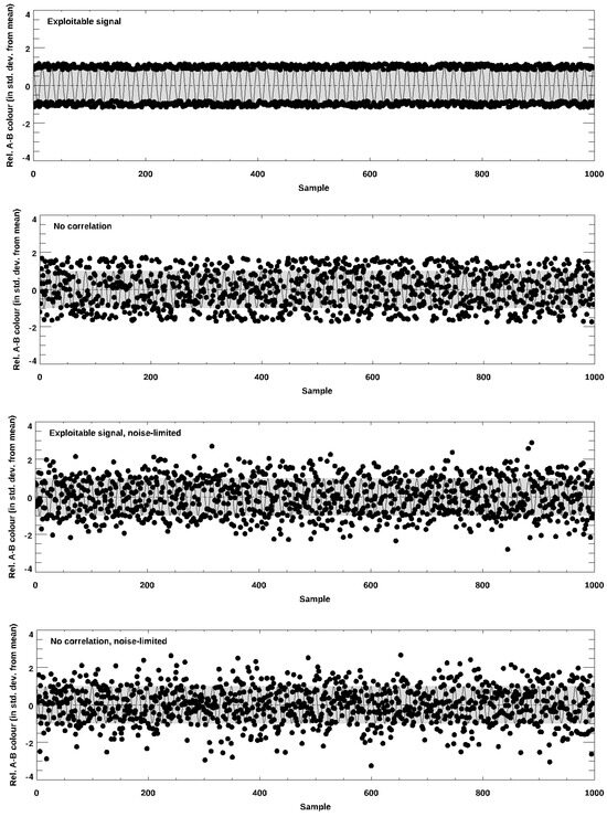 Optical or near-infrared (NIR) photometry from any single observatory site hinders a QM-test experimental cadence fast enough to remove the fair-sampling assumption for quasars separated by more than where both have . That is due to the two switching telescopes being, at most, kilometers apart, where is in light travel time, i.e., ∼1 MHz rates. However, a typical quasar has a V-band AB-magnitude of about 20 [12] (roughly the same as the dark sky in ) and similar to 1 micron, which, even for an idealized unobstructed 8 m class telescope with perfect throughput (that splits light into two bandpasses), provides a fluence of less than 18 photons in 10 milliseconds under photometric skies at low elevation when operating at a reasonable observing limit of extinction. Despite a good vision of , this would be against a background of below 2 photons, providing an individual exposure signal-to-noise ratio (SNR) of over 10 for each quasar. A sampling cadence of would then be the fastest possible means of retaining a sufficient SNR against the sky background flux for the simultaneous two-band photometry of both quasars while reaching a colour-discrimination per sample of uncertainty, and this would work less well for realistic efficiencies. Finding brighter sources or choosing broader passbands could double the SNR, but this would still be four orders of magnitude slower than the telescope-to-telescope signalling rate. That is a problem because millisecond and longer-lasting oscillatory correlations might naturally arise due to the self-similar Kolmogorov scaling of wavefront aberrations, particularly at smaller telescope angular separations, without any ability to discriminate those against fluctuations due to the sources themselves. Adaptive optics (AO) may help, as such systems routinely sense these phase errors at kilohertz rates at wavelengths of near and utilize their index-of-refraction behaviour to manipulate them longward of or so into the NIR: these photons can be redirected with a fast-moving optic. This results in a sharpened image that may be diffraction-limited at , more readily improving photometry by a factor of 2 or so and leaving an uncorrected fraction at lower frequencies (e.g., [13]). However, even with this assistance, the practical sampling cadence is too slow to exclude all higher-frequency intrinsic correlations (or correlated noise) that can provide a prediction for the next experimental outcome, whether the quasar switching-photon sample of either band at each telescope falls inside the seeing disk or not.