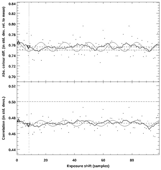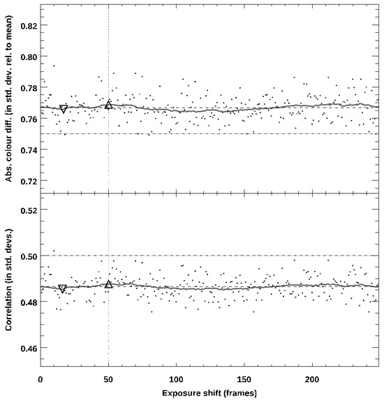An auto-correlation analysis identical to that described in Section 2.2 was also carried out, which confirms the random nature of the observed colours, as shown in Figure 10. Shifts of up to 5 s were allowed; the vertical dotted line indicates the time period during which the two local instrument clocks could be out of sync; there is no evidence of an improved correlation within that window. It is perhaps no surprise that the simultaneous colours of these stars are random, but it is still a useful excercise. That is because although these observations were undertaken at 0.06 s cadence, ‘Alopeke/Zorro are capable of 0.01 s exposures—shorter than the telescope-to-telescope light-travel time—as will be shown in the next section, which can allow for a test to be conducted for two quasars, which are both much fainter, but still provide sufficient photons to obtain an image at the highest framerate.