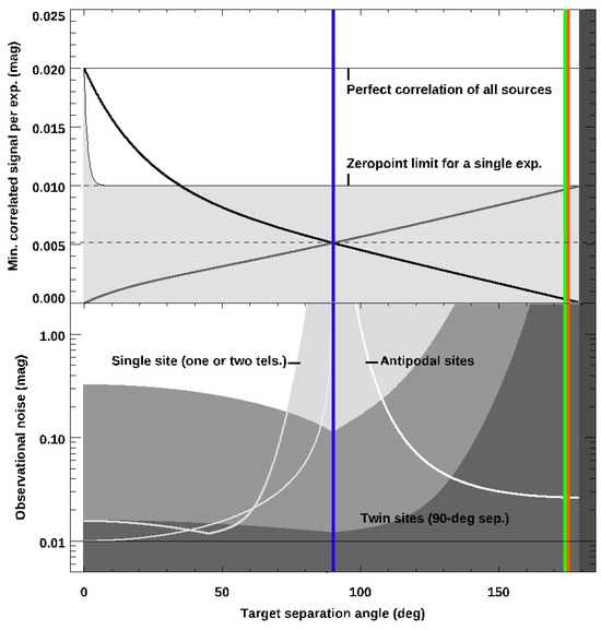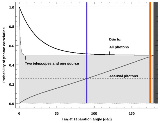 Using the results from Section 4 on bright stars for comparison, the tool’s output is plotted in Figure 11: A-B observed-colour SNR for 3000 samples at 50 Hz. Alopeke/Zorro results are indicated by black-outlined stars; all others show the 18.5 R-mag and brighter quasars selected from the MILLIQUAS sample [12]; either (the mean sample reshift) separated by , or each has a (possibly photometric) redshift of ; those with a separation of are indicated by open down-pointing triangles. At all smaller separation angles, these are indicated by the minimal fraction of acausal photons per sample (dark grey filled circles) and causal (black). Where these would be visible to both telescopes, they are outlined by a grey circle; a black square indicates when it is, in fact, the same source, with zero separation. Coloured and shaded regions indicate the expected model-SNR limits for fair-sampling at other telescope site choices (Equation (2), with ): light grey is a limiting case if a single telescope has a field of view over the whole sky; blue denotes a single site with two telescopes; green indicates two sites with exactly separation on Earth; yellow indicates antipodal sites. There is an upper limit (for separation) from the model at 50 Hz, but the flux matches that of the observed stars (dashed curve).