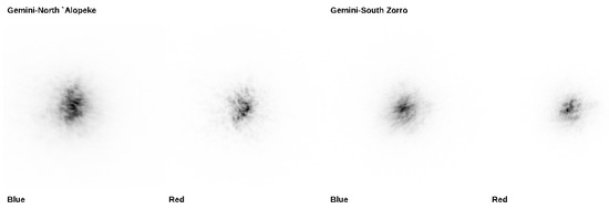 Sample images from the Gemini ‘Alopoke/Zorro dataset with blue and red filters. These are the simultaneous integrations of two bright stars, one from the North and one from the South.
