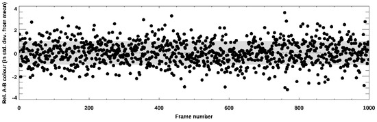 Sample A-B colour photometry for one 1000-sample sequence of ‘Alopeke/Zorro data. This is the first sequence from the data of 9 October 2019.
