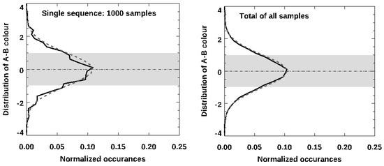 This photometry was then converted to a difference relative to the standard deviation of the colour for the whole sequence; hence, it was reported as the std. dev. from the mean, as defined in Section 2.1. The results for one sequence are shown in Figure 8; that is, the A-B colour of the two stars in each frame. The chosen convention was that the object labelled A was that observed with ‘Alopeke and object B was that observed with Zorro. A linear fit for colour over the sequence was also subtracted to ensure that no trend was due to airmass changes, although this was found to have a negligible effect, well under 1%. The grey band in Figure 8 delineates 1 std. dev. above and below the slope-corrected mean. The resulting distributions are shown in Figure 9; both show one individual sequence of 60 s (left shows those from the same sequence as shown in Figure 8), and the combination of all 12 available observations is shown on the right; both of these are indistinguishable from the Gaussian (dashed curve) normalized to the same peak.