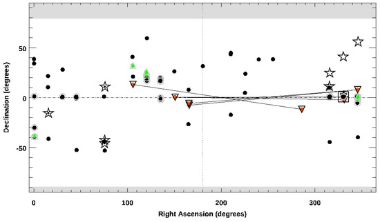 Source pairs on the sky; symbols are those shown in Figure 11; here, the acausal quasar pairs are connected by a thin black line segmment; the South (B) star of the pair is indicated by a central black dot.