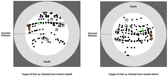 Two further outputs help to visualize the orientation of the potential targets on the sky, and possible scheduling of observations: Figure 12 is a plot of right ascension and a declination of the targets displayed in Figure 11 as being visible in the coming year. Note the East–West alignment of acausal quasar pairs that are separated by (down-pointing tringles, with red filled circles). For comparison, the previously observed stars are shown; a black central dot indicates those viewed from Gemini South. In Figure 13, the polar projections of the visibility of the targets are shown for Gemini South (left) and Gemini North (right); again, it is clear that suitable acasual quasar pairs are visible towards the low eastern horizon (Gemini South) and western sky (Gemini North) simultaneously.