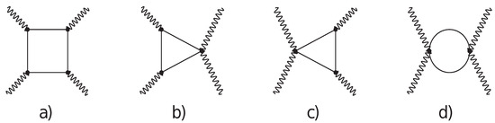 Shown are the box (a), triangle (b), (c) and bubble (d) diagrams contributing to low-energy photon–photon scattering. Here, the solid lines represent massive charged particles, while the wiggly lines are photons.