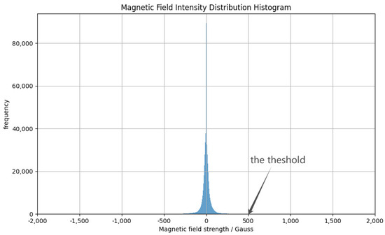 Magnetic field intensity distribution of all sample pixels in the photosphere. The horizontal axis represents the strength of the magnetic field in Gauss, and the vertical axis represents the corresponding frequency. Data with magnetic field strength greater than the threshold value were counted as 500 gauss.
