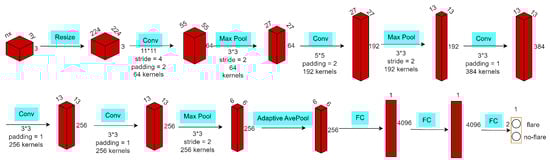 AlexNet structure. AlexNet contains eight layers that can learn weights. The red cube represents the shape of the sample data in different layers, and the blue rectangle represents the operation and layer. Conv represents the convolutional layer, MaxPool represents the maximum pooling layer, and FC represents the fully connected layer. The network output is a two-dimensional one-hot vector representing the probability of a flare outbreak.