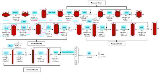 When cross-layer composition is carried out, the problem of dimension mismatch is likely to occur. In order to ensure that the input and output can be added correctly, the residuals need to be raised or reduced dimensionally through a convolution layer with a convolution kernel of 1 × 1 when combining across channels. After the weights are trained, ResNet-18 uses a 512 × 1 × 1 averaging pooling layer to map the residual fast output to a feature vector with a 512 length and finally a linear layer to obtain the output. ResNet-18 has achieved good classification results in flare prediction tasks. Its architecture is shown in Figure 4: