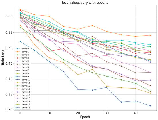 The 20 curves of loss as a function of epoch number. The horizontal axis represents the number of epochs trained, and the vertical axis represents the loss. The 20 curves represent each of the 20 zlevels.