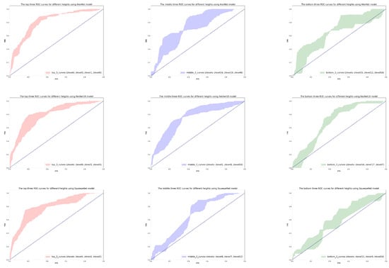 ROC curves for different models at different heights.The left, middle, and right figures represent the ROC curves of the AlexNet, ResNet-18, and SqueezeNet models at different magnetic field heights. The red area represents the area surrounded by the three curves with the highest AUC value, the blue area represents the area surrounded by the three curves in the middle of the AUC value, and the green area represents the area surrounded by the three curves with the lowest AUC value.