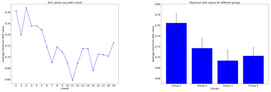 The curve of AUC changes with the height of the magnetic field; the left figure represents the maximum value of the average AUC as a function of the height of the magnetic field; the X-axis in the right figure represents different groups, combining five zlevels into one group; the Y-axis represents the mean value and standard deviation of the AUC of five zlevels.