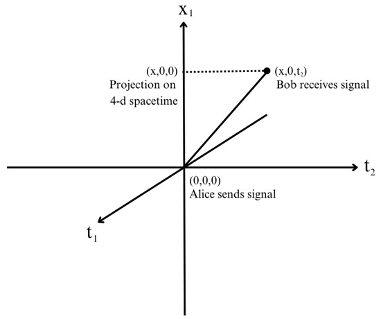 Consider the 2D spacetime [which represents our spacetime in which Alice and Bob make measurements]. In such a case, while observing the event, we will naturally assume that and conclude that and that the separation between the sending of a signal and the receiving of the signal is space-like and, hence, nonlocal. This is as though faster-than-light influence has taken place. However, in the 3D universe, the event is local and obeys special relativity.