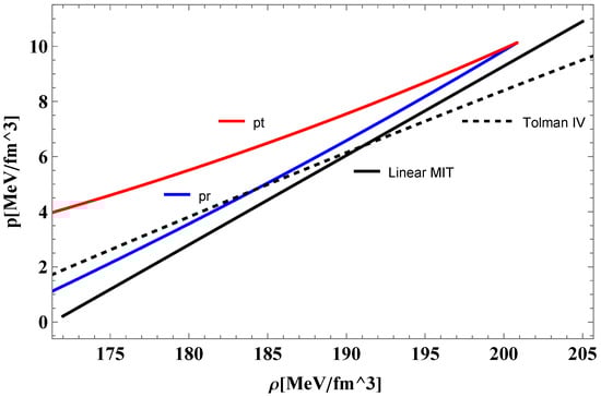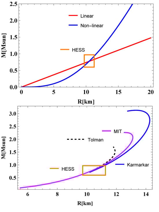 Furthermore, the relations between the energy density and both pressures are shown in the lower panel of Figure 1. The pressures increase with the energy density, which is the typical behavior of any equation-of-state. Since they seem to be almost linear, we make a comparison with a linear MIT bag model EoS, (extreme model SQSB40) [], see the discussion below for more details on that model. The relation corresponding to the Tolman IV solution (see Section 4.2) is also included. What is more, since there is an analytic expression both for the stellar radius and the stellar mass in terms of the constant parameters , we may generate the M-R relationships displayed in the upper panel of Figure 1. The red curve is a straight line corresponding to fixed and varying A, whereas the blue curve is a non-linear function that is obtained fixing and varying B or fixing and varying C. The two curves meet at the point that represents the HESS compact object modeled in the present work. Finally, using the relationship one may solve the TOV equations numerically to obtain the M-R relationship shown in the middle panel of Figure 1. It does not come as a surprise that it looks very similar to the M-R profiles of strange quark stars. The profiles of the quark star and of the HESS object modeled via the Tolman solution, too, are shown for comparison reasons. We have included the allowed stellar mass and radius range of the HESS compact object as well.
