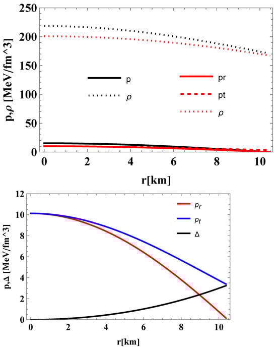 Next, all the quantities of interest, such as sound speed, factor of anisotropy, etc., versus r are displayed in the Figure 2 and Figure 3 below. In particular, Figure 3 shows the speed of sound and the relativistic adiabatic index, in both directions, versus r. In the lower panel of Figure 2, it is observed that the tangential pressure is larger than the radial one, and so the anisotropic factor is positive. For the sake of comparison, we show in the same plot (upper panel of Figure 2) the energy density and the pressure of a quark star made of isotropic matter. The red color corresponds to the analytic solution discussed here, whereas the black color corresponds to the quark star assuming a linear EoS of the form (extreme model SQSB40) []