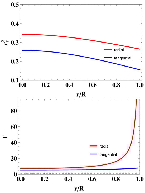 Speed of sound (upper panel) and relativistic adiabatic index (lower panel) versus dimensionless radial coordinate, , for the HESS compact object. The horizontal dashed line corresponds to the critical value of . The red curves correspond to the radial direction, while the blue curves correspond to the tangential direction.