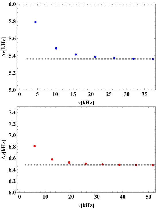 The frequencies of the 8 lowest modes (fundamental, and seven excited modes, ) are shown in Table 1 both for the anisotropic HESS compact object (modeled here via the Karmarkar condition) and the isotropic HESS compact object (modeled in [] via the Tolman solution) of very similar stellar mass and radius. Moreover, the large frequency separations are displayed in Figure 4, while the corresponding eigenfunctions are shown in Figure 5. We observe that the large difference separations tend to a certain constant at highly excited modes, in agreement to the asymptotic theory []