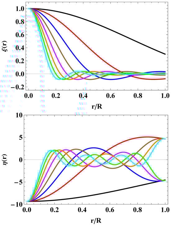 Radial profiles of eigenfunctions versus normalized radial coordinate, for the fundamental mode, , as well as seven excited modes, . The upper panel corresponds to the function, while the lower panel to function.